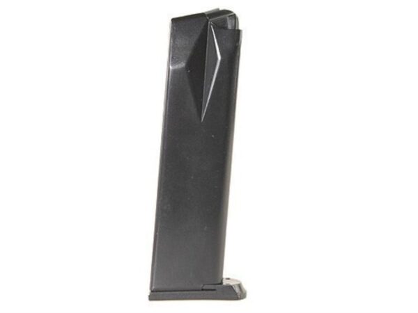 A 15-rd magazine for the Ruger P93/P95 pistols in 9mm. Constructed from heat-treated blued- steel with a follower lock-plate and base-plate molded from a proprietary DuPont Zytel based black polymer; and using a spring wound from Chrome-silicon wire and heat-treated for strength and reliability.